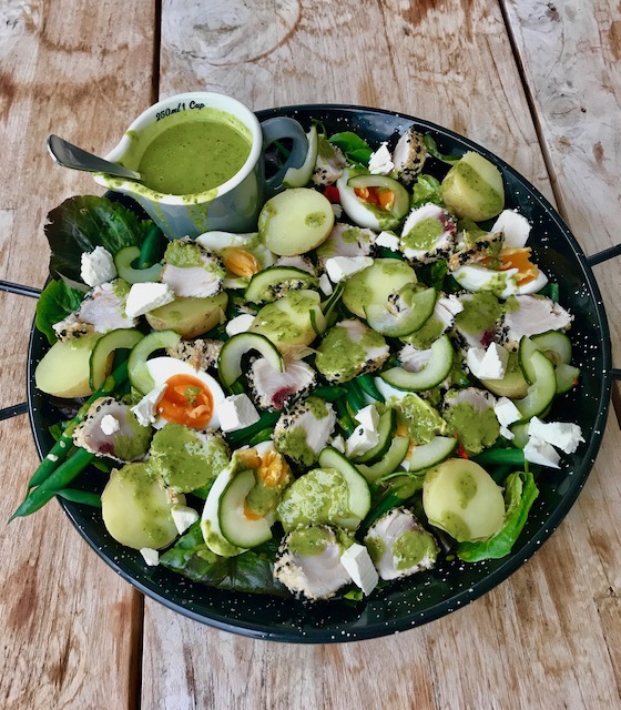 This is a gorgeous Tuna Nicose recipe by Jamie Oliver , In the photo I crumbed the tuna loin with black and white sesame seeds and seared it quickly and added cucumber and boiled new small potatoes and left out the tomatoes for my non loving tomato family but all completely optional .